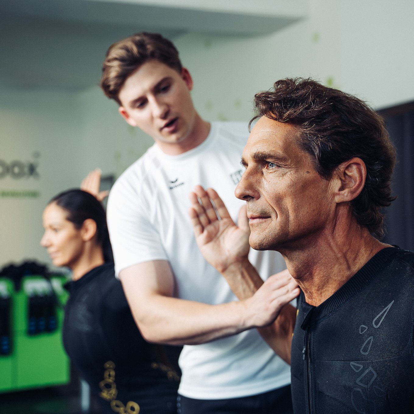 Dein EMS-Anzug wird individuell angepasst und mit dem Trainingsgerät verbunden. Keine Sorge: Du wirst langsam an die Impulse herangeführt – alles geschieht unter Anleitung.
